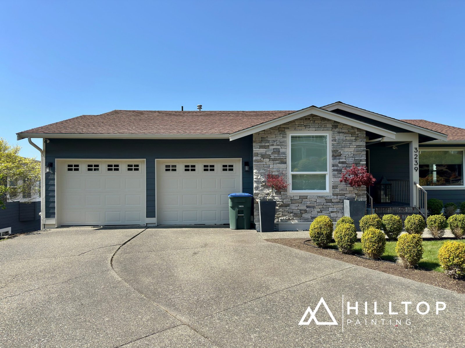 Hilltop Painting recently completed an exterior repaint project in Bellingham, Washington. The home received a full refresh using Sherwin-Williams Super Paint Satin in the color SW 6241 Aleutian, giving it a modern and durable finish.